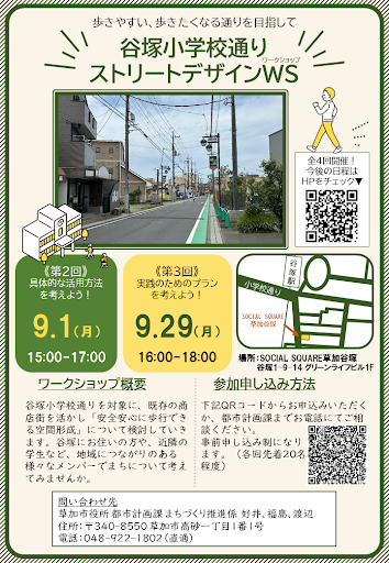 9/1(月)、9/29(月)にソーシャルスクエア草加谷塚店(運営法人:NPO法人ソーシャルデザインワークス 代表理事:北山剛)で、草加市都市計画課主催の「谷塚小学校通りストリートデザインWS(ワークショップ)の第2回、第3回が開催されました。