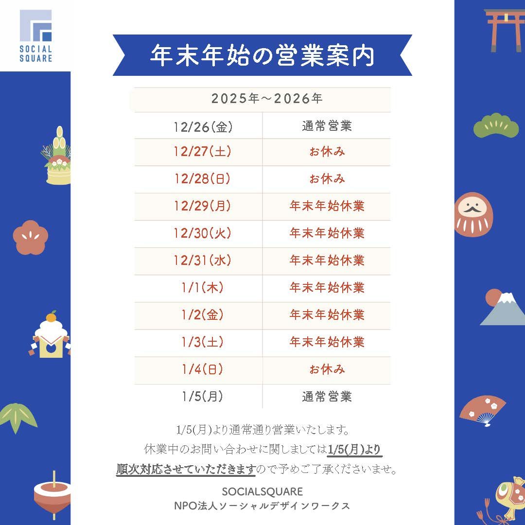 年末年始のソーシャルスクエア全店舗および運営法人・NPO法人ソーシャルデザインワークスの営業は2025年 12/26 (金)8:30-17:30 が年内最終営業日2026年 1/5(月)8:30~が年始最初の営業日となります。